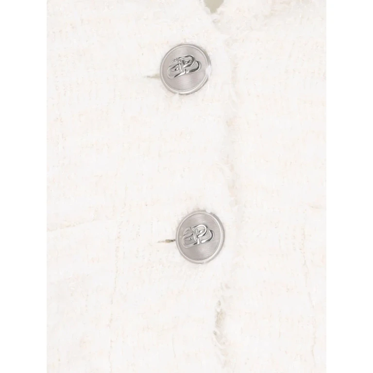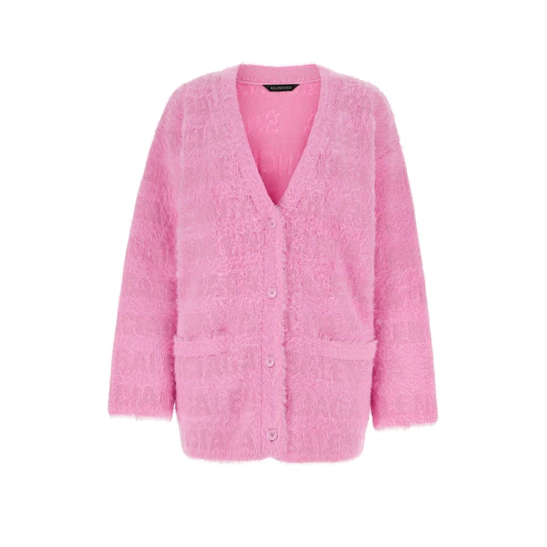This Balenciaga cardigan features a cropped silhouette crafted from textured tweed fabric. It includes a button-front closure and long sleeves, designed for layering in various settings.