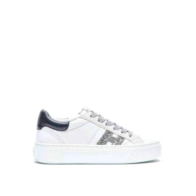 White women's sneakers with cross-ventilated design, leather upper, and glitter logo.