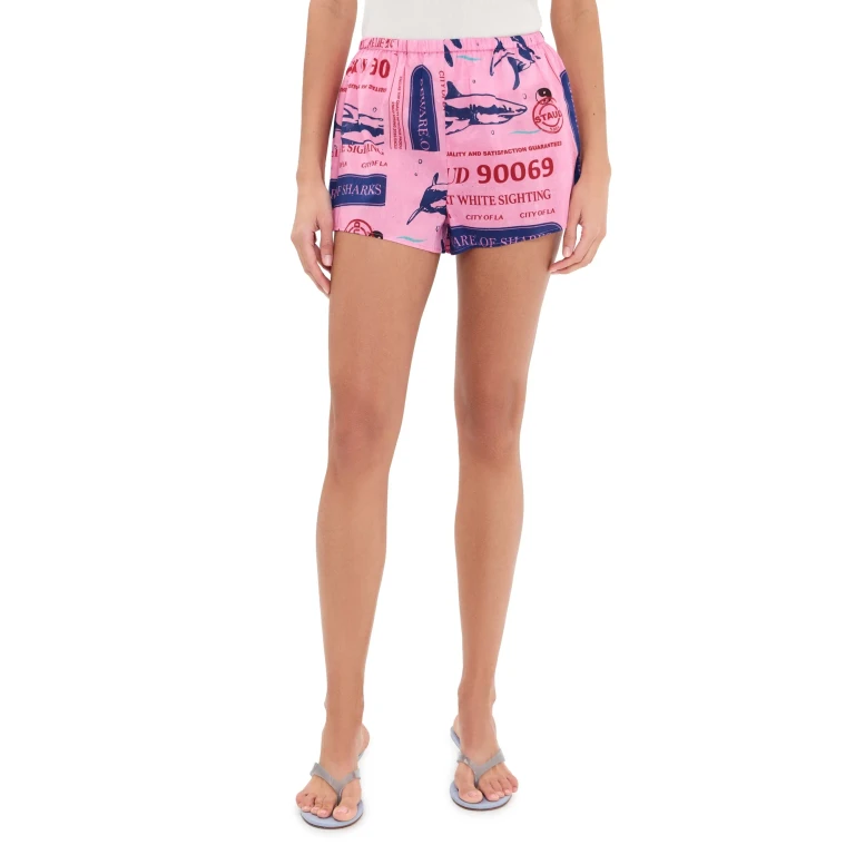 Diese Paddle-Shorts von Staud zeichnen sich durch ein Parcel-Print-Muster in der Farbe Pink aus. Sie sind für den Einsatz als Badebekleidung konzipiert und bestehen aus wasserbeständigem Material. Das Modell ist in der Größe Medium erhältlich.