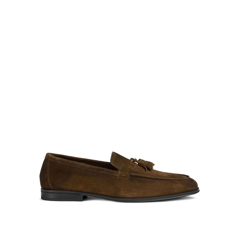 Mocasines de cuero trenzado con punta almendrada, borlas tono sobre tono y construcciĂłn Blake.