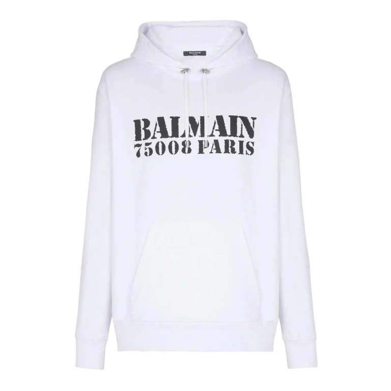 Sweat-shirt noir à capuche ajustable avec cordon de serrage, aglets et bascule en métal argenté, logo vintage Balmain brodé ton sur ton, poche kangourou, bords côtelés.