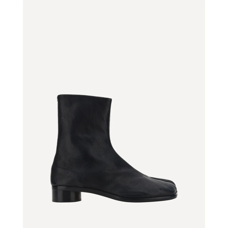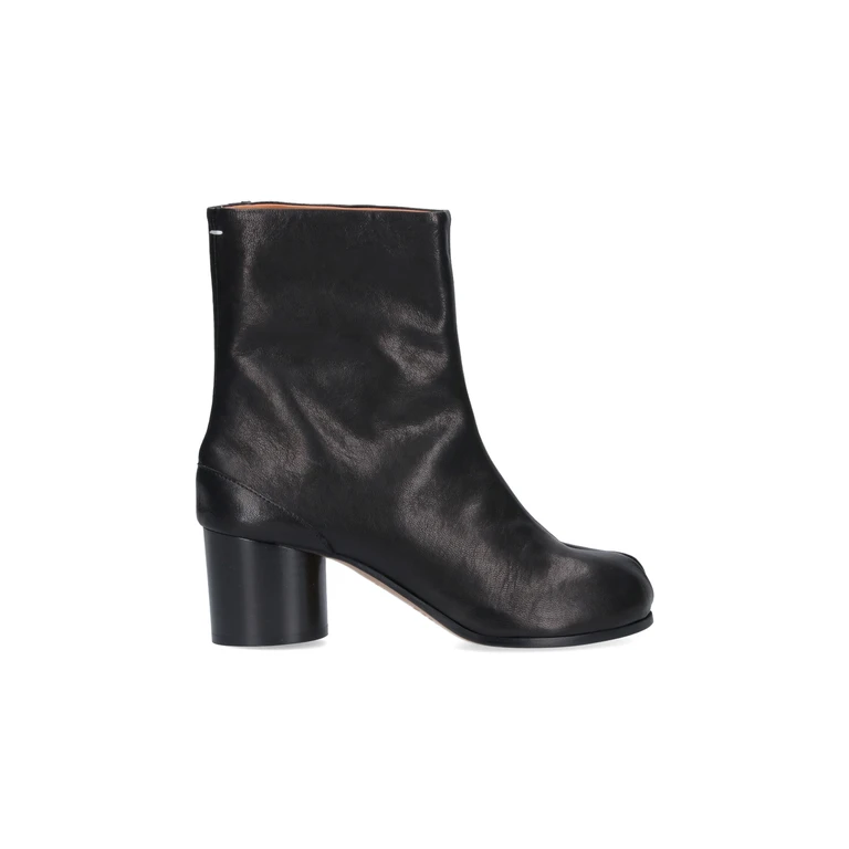 Bottines en cuir grainé marron camel avec une construction tabi à bout fendu et fermeture à glissière arrière.