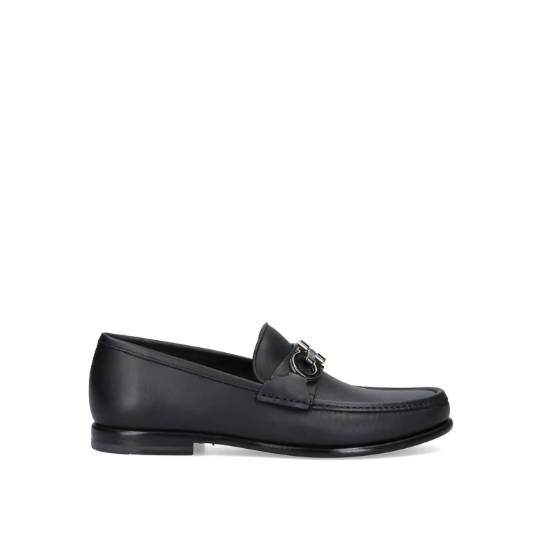 Mocassini in pelle di vitello nera con dettagli metallici Gancini reversibili argento e oro.