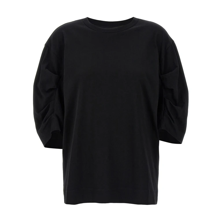 コットンジャージーのクルーネックTシャツで、長いプリーツスリーブとドロップショルダーが特徴。