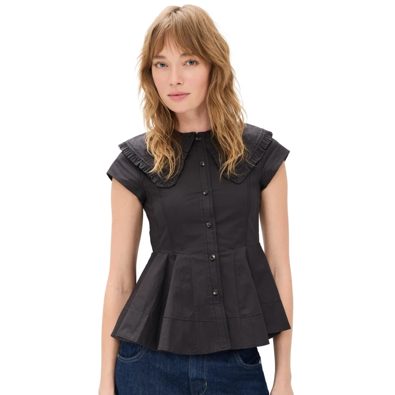 このGANNIのシャツは、ストレッチ性のあるコットン混紡素材を使用し、特徴的なピーターパンカラーをあしらっています。フロントはボタンダウン仕様で、全体にプリントが施されたデザインです。