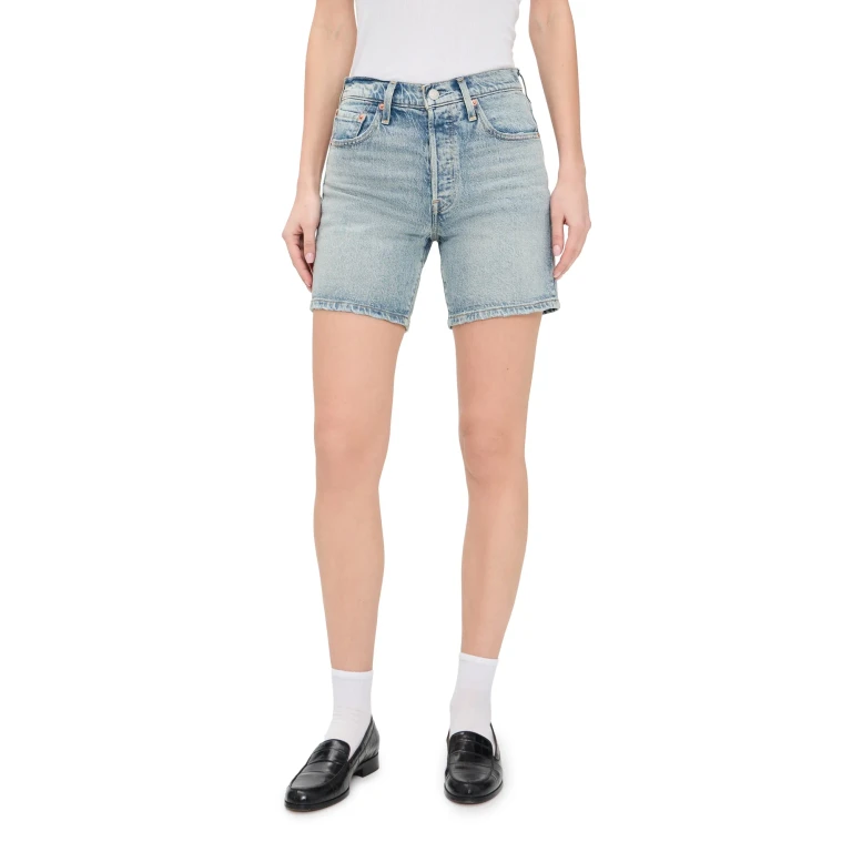リーバイス501のシルエットをベースにした、ミッドサイ丈のレディースデニムショーツです。伸縮性のないコットンデニム素材を使用しており、伝統的なボタンフライと5ポケットのデザインを採用しています。