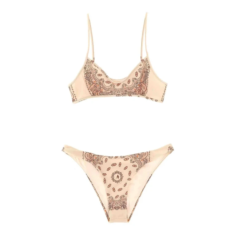 밴다나 프린트 비키니 세트로, 브라렛 탑과 측면 레이싱이 있는 팬티로 구성되며 신축성 있는 폴리아미드-엘라스테인 혼방 소재입니다.