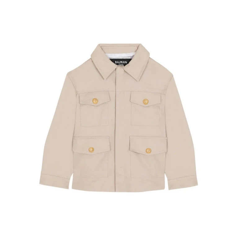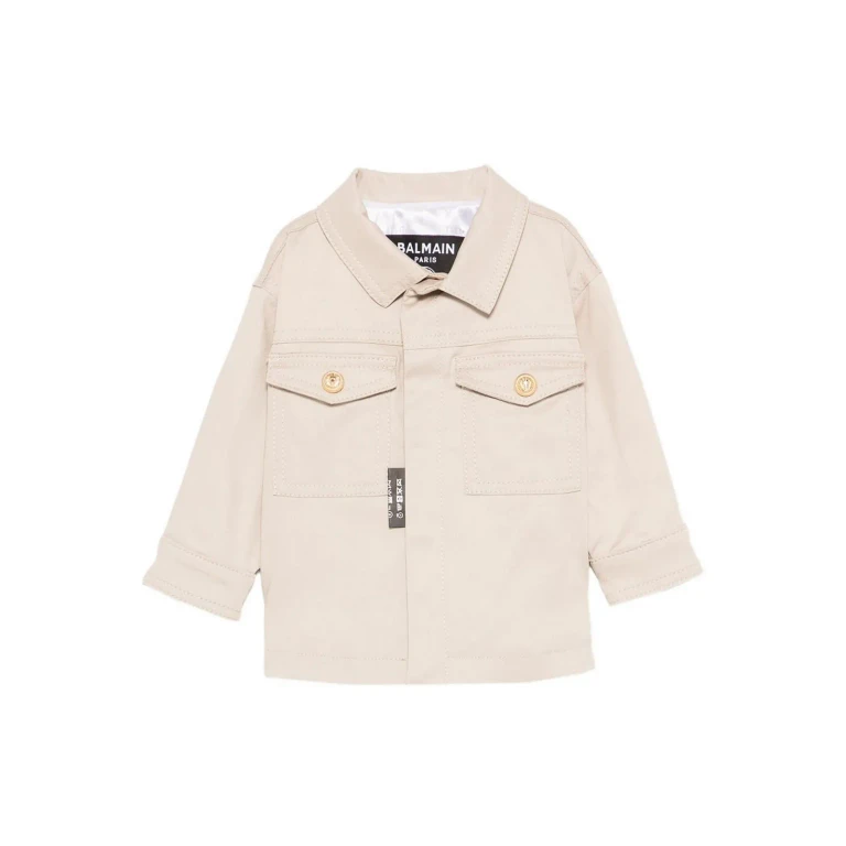 Balmain의 화이트 캐주얼 재킷으로, 포인트 칼라, 긴 소매, 버튼 플랩 포켓이 특징입니다.