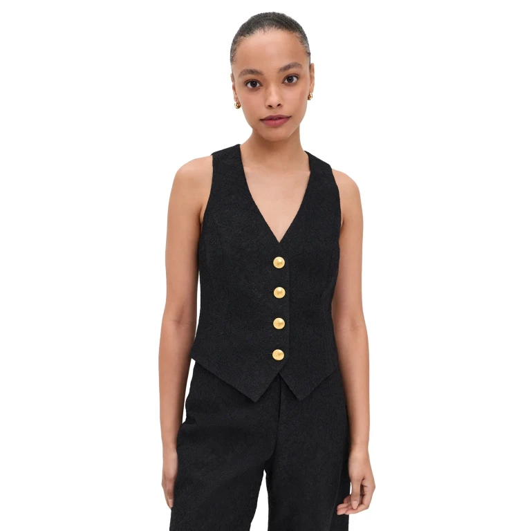 L'AGENCE의 키노 베스트는 본디드 레이스 소재로 제작된 블랙 컬러의 여성용 의류입니다. 슬리브리스 디자인으로 단독으로 착용하거나 재킷 또는 코트 안에 레이어드하여 활용할 수 있습니다.