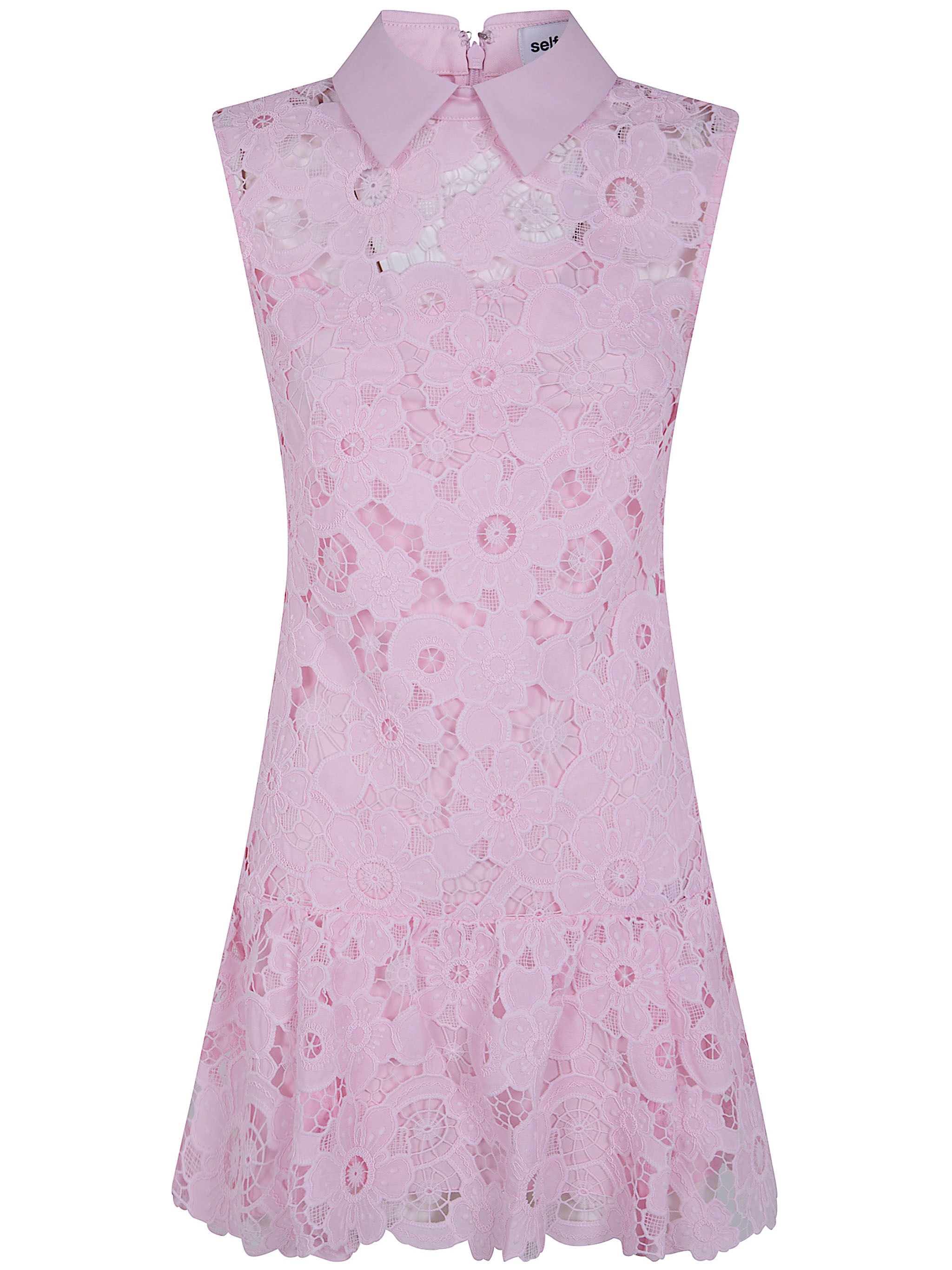 셀프포트레이트의 이 미니 원피스는 정교한 핑크색 레이스 소재로 제작되었습니다. 칼라 디테일이 돋보이는 디자인으로 격식 있는 자리나 특별한 행사에 적합한 실루엣을 제공합니다.