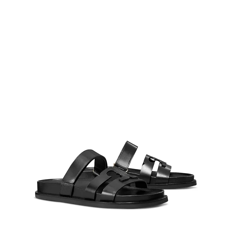 Een damesslide-sandaal met leren bovenwerk en voering, rubberen zool.