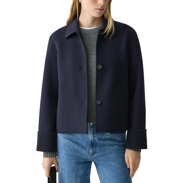一款女式裹身夹克,采用羊毛和羊绒混纺面料,经典廓形。
